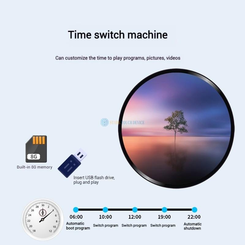 The custom round LCD panel, available in 15.7" and 23.6" sizes, features a built-in PC and wall-mount design. With Android 11 support, high brightness of 700 nits, and optional touch capability, it’s perfect for innovative digital signage.