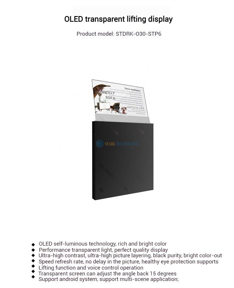 The 30" Voice-Controlled Elevating Transparent OLED Screen offers a cutting-edge display solution for modern retail and exhibition environments. Key features include: