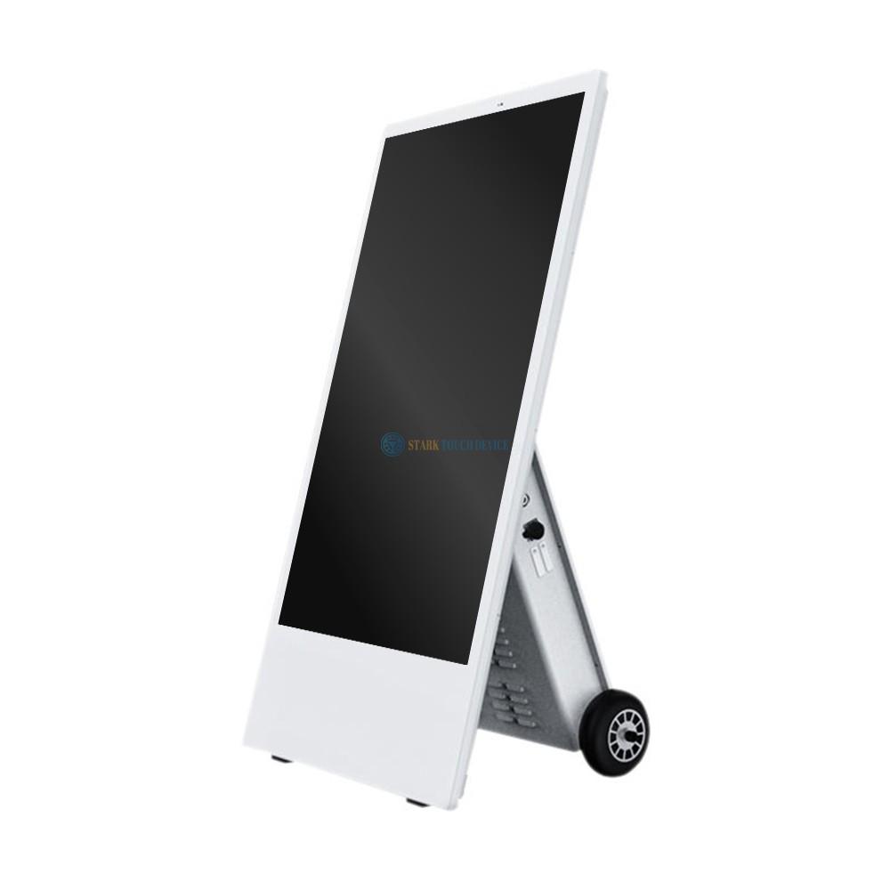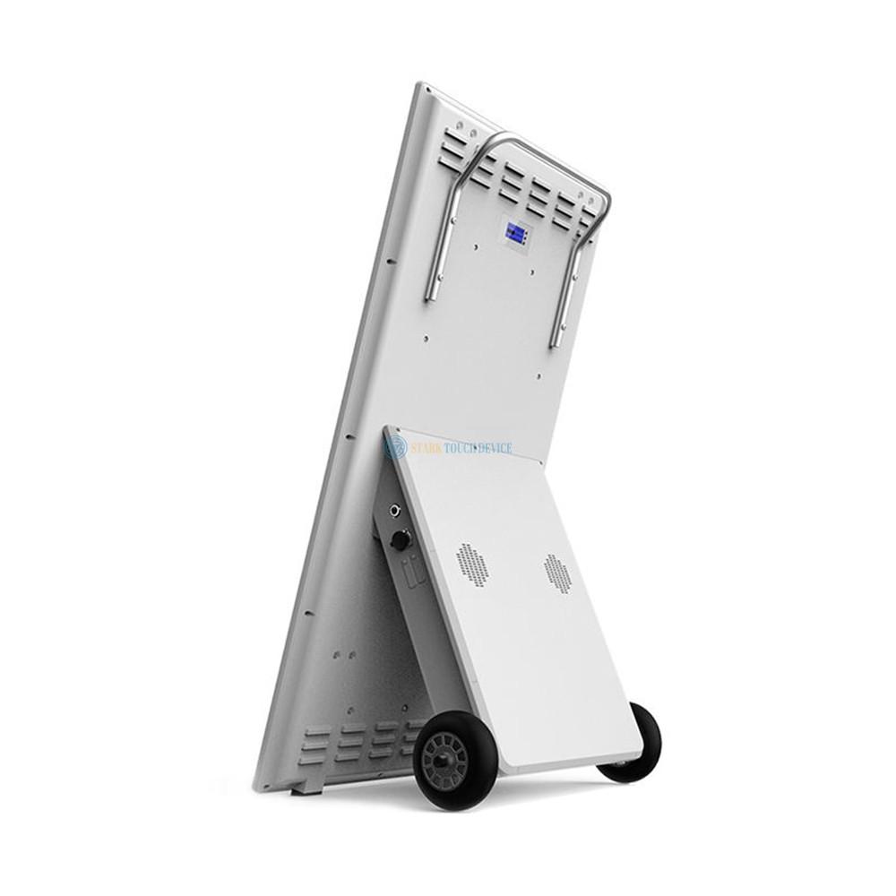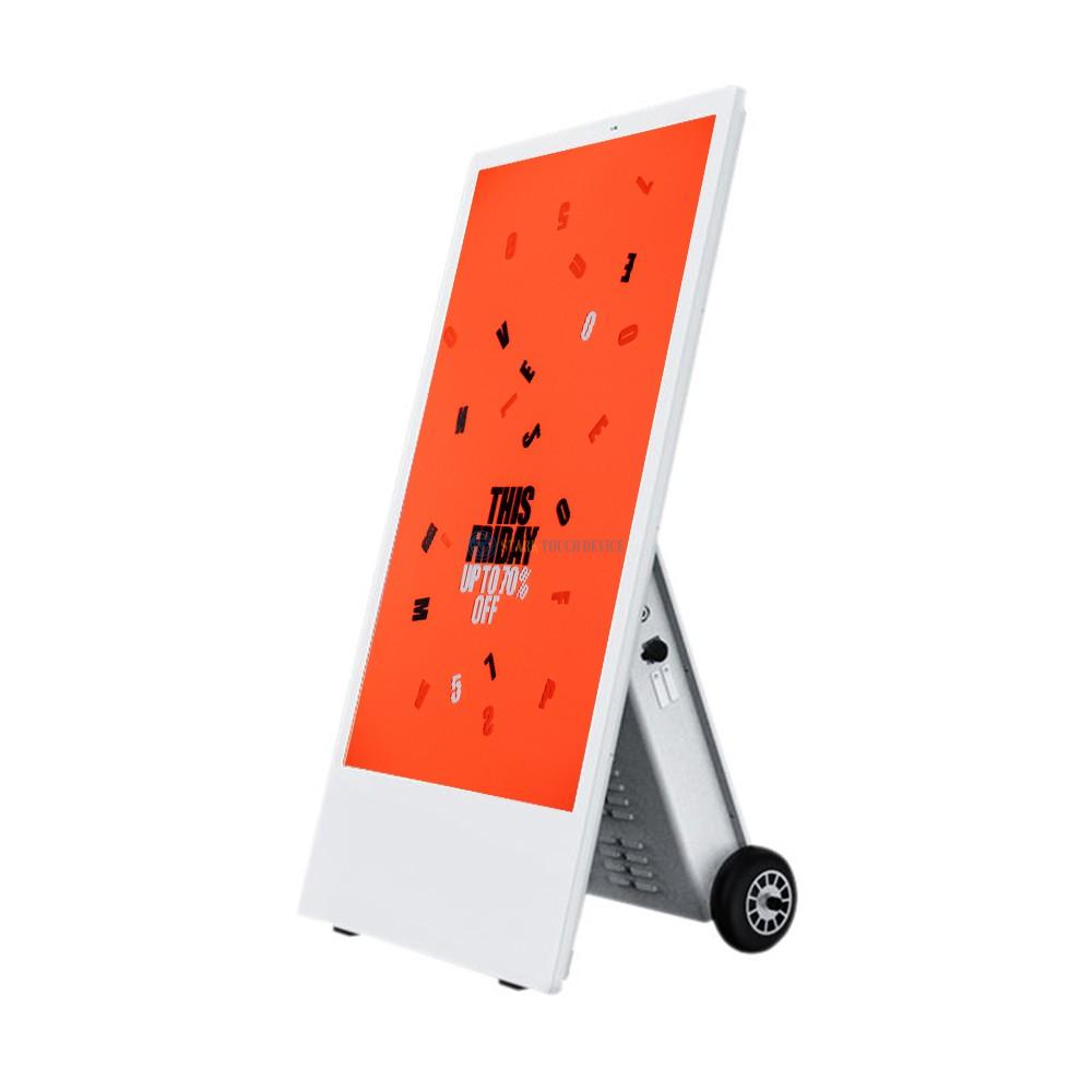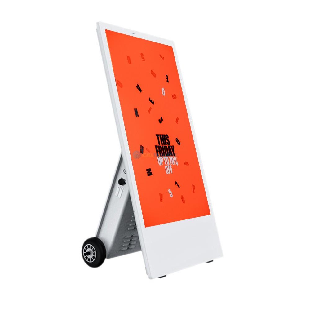Core FeaturesThis IP65-rated movable display delivers 800 nits brightness for clear visibility in direct sunlight. The anti-glare capacitive touchscreen responds accurately even with wet hands – perfect for outdoor retail promotions and event advertising. Durability Highlights - Reinforced aluminum frame withstands wind loads up to 60km/h - Wide temperature operation (-30°C to 50°C) for extreme climates - Chemical-resistant screen coating for industrial environments Deployment Scenarios ▶ Construction Site Safety: Display real-time hazard alerts at multiple zones ▶ Pop-up Stores: 36-hour battery supports mobile promotions ▶ Drive-thru Menus: Integrated VESA mounts for fast repositioning Technical Specifications | Parameter | Value | |-----------------|---------------------------| | Touch Points | 10-point multi-touch | | Battery | 36h continuous use | | Certifications | IP65, CE, EMC Class B |